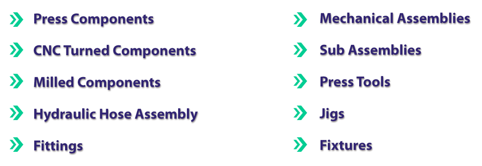 We Specialise Design, Development, Manufacturing, Assembly, Testing and Supply in Press Components, CNC Turned Components, Milled Components, Mechanical Assemblies, Sub Assemblies, Press Tools Jigs, Fixtures and Hydraulic Hose Assembly and Fittings